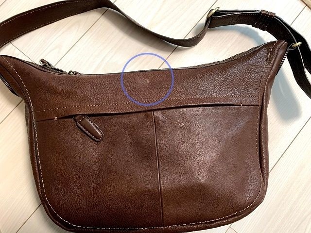 先日、自転車のカゴに他の荷物と一緒に入れて移動したら、なんと革の表面に小キズがついてしまったんです!